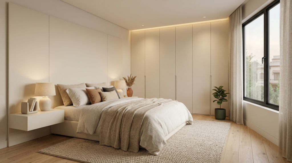 BedroomResidentialSoft Finish Finish: Soft Touch Matt — WQ Series Space:A master bedroom designed entirely around rest. WQ Series Soft Touch Matt in warm off white used across the headboard panel, side tables, and built in wardrobe. The finish does exactly what the name says soft to the eye, softer to the touch. A room that feels like exhaling.