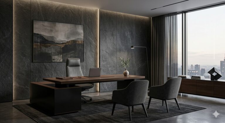 COMMERCIALKP Series SpaceSTONE TEXTURESync TextA commercial office interior designed to communicate professionalism from the moment you walk in. KP Series Sync Text finish structured, considered, and built for a space where first impression matters every single day