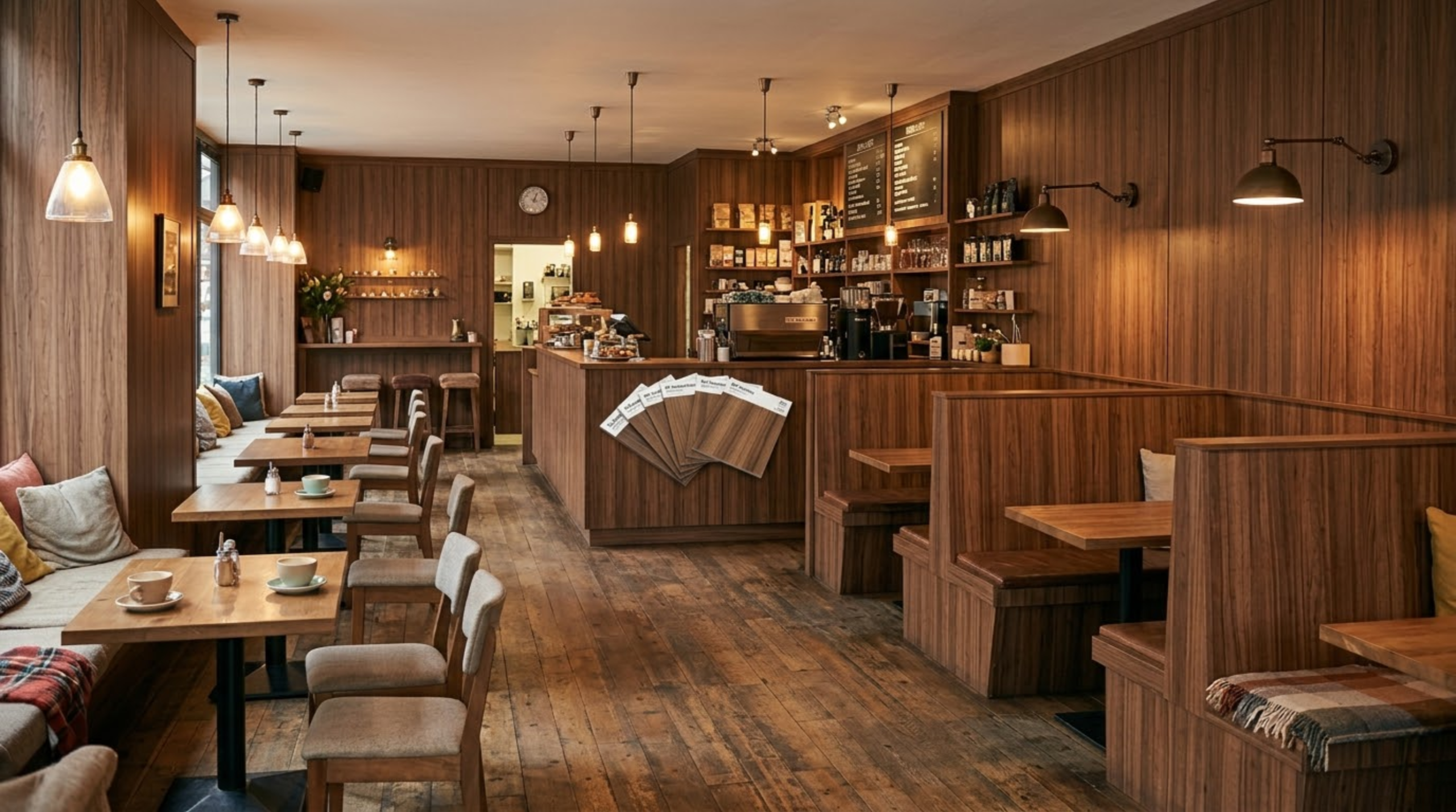 HospitalityRestaurantWood Finish: Deep Sync TextA cafe interior built on texture and warmth. KP Series Deep Sync Text across all wall panels, the bar front, and booth dividers giving the space the feel of natural wood without the cost or maintenance. The kind of place where people stay longer than they planned.