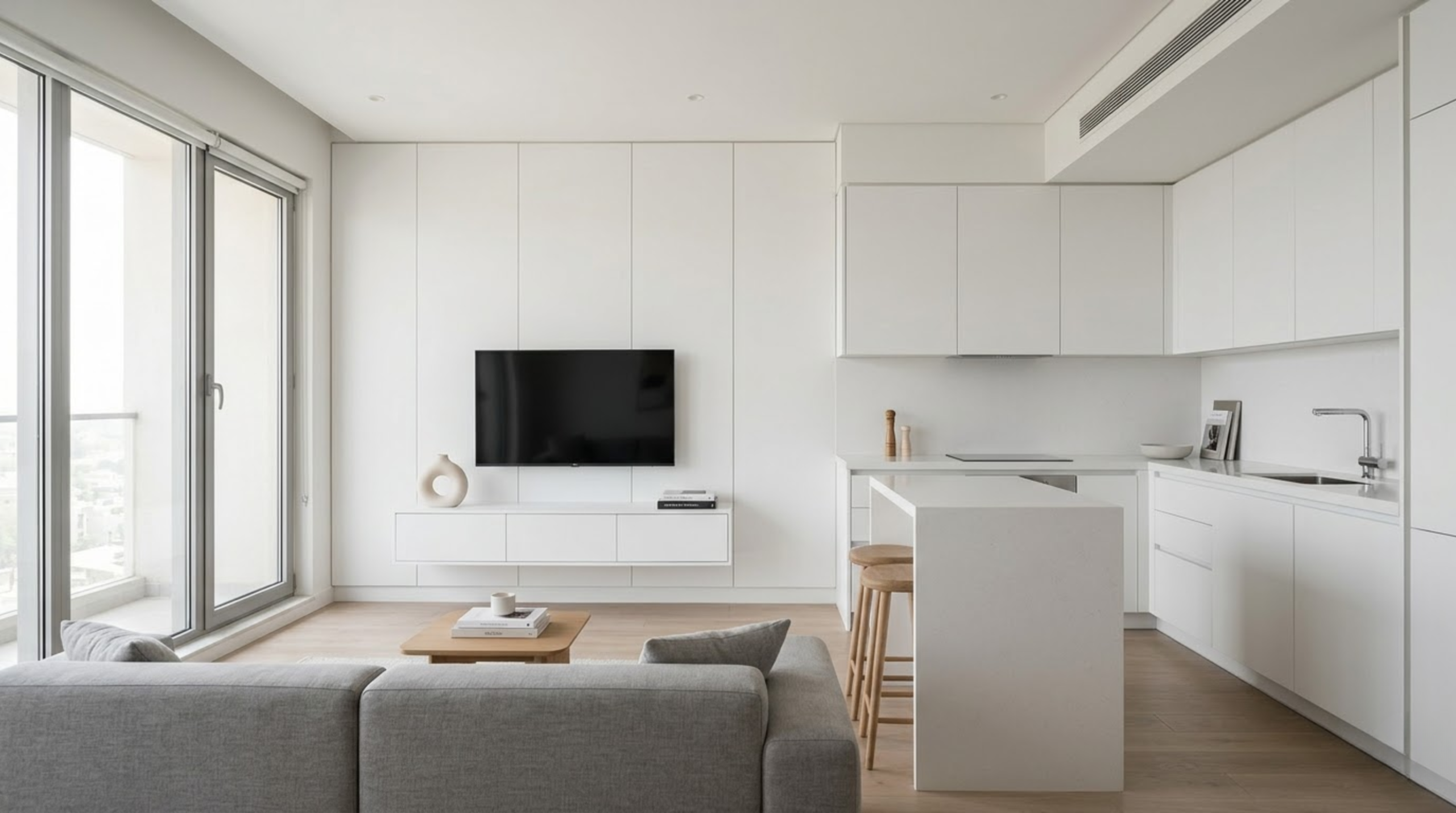 Feature WallMinimal Finish: Solid WhiteResidentialA compact apartment interior where every surface decision mattered. WQ Series solid white finish across the feature wall, TV unit, and kitchen cabinets creating a seamless, light filled space that feels twice its size. Minimal by design. Intentional in every detail.