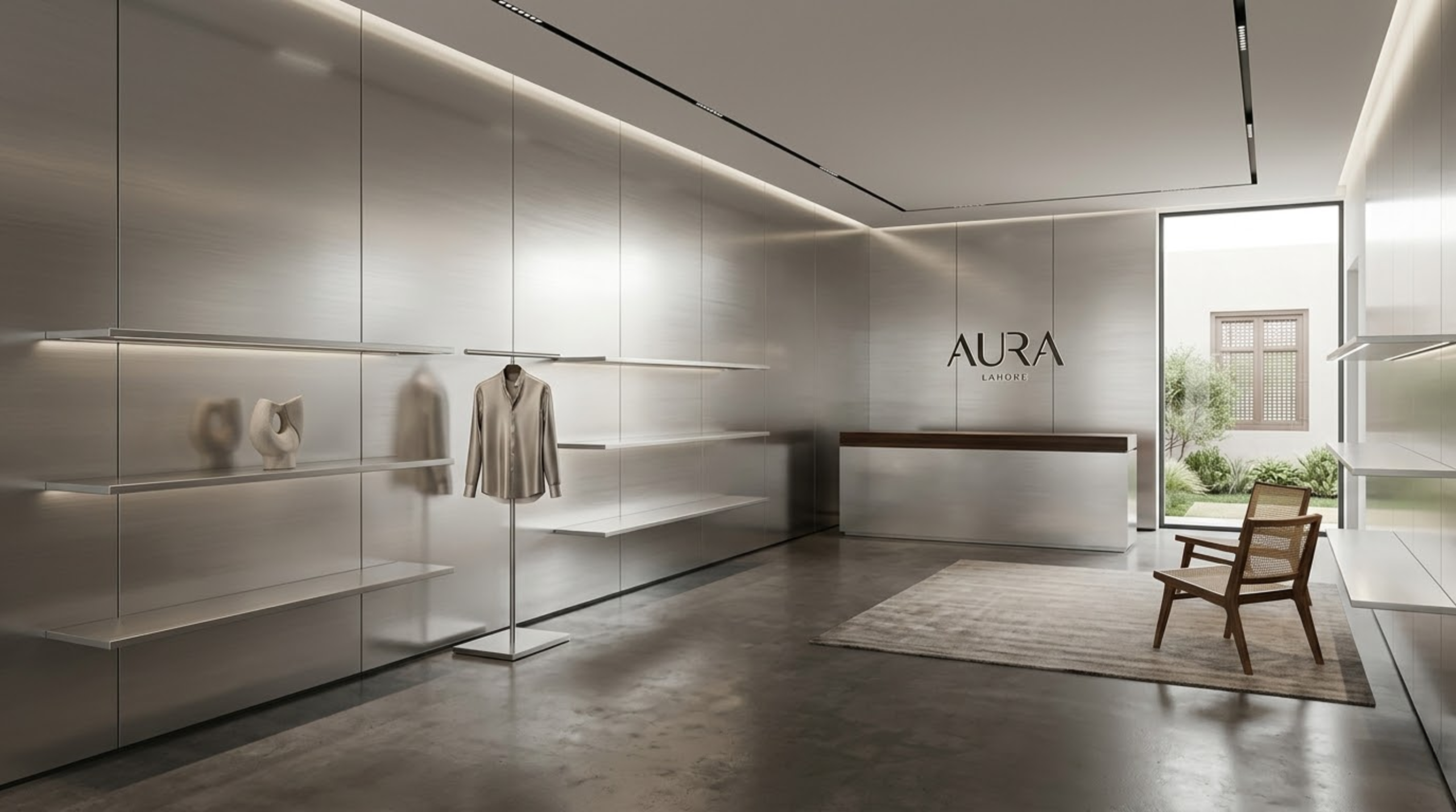 Brushed Silver InoxCOMMERCIALMetallic Finish:RetailA high end retail studio fit out for a fashion label. LM Series Brushed Silver Inox across display shelving, wall cladding, and the checkout counter giving the space a premium, gallery like quality. A finish that communicates value before a single product is placed on the shelf.